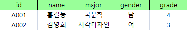 INSERT INTO 학생 VALUES ('A003','강하늘','컴퓨터공학','남','2');