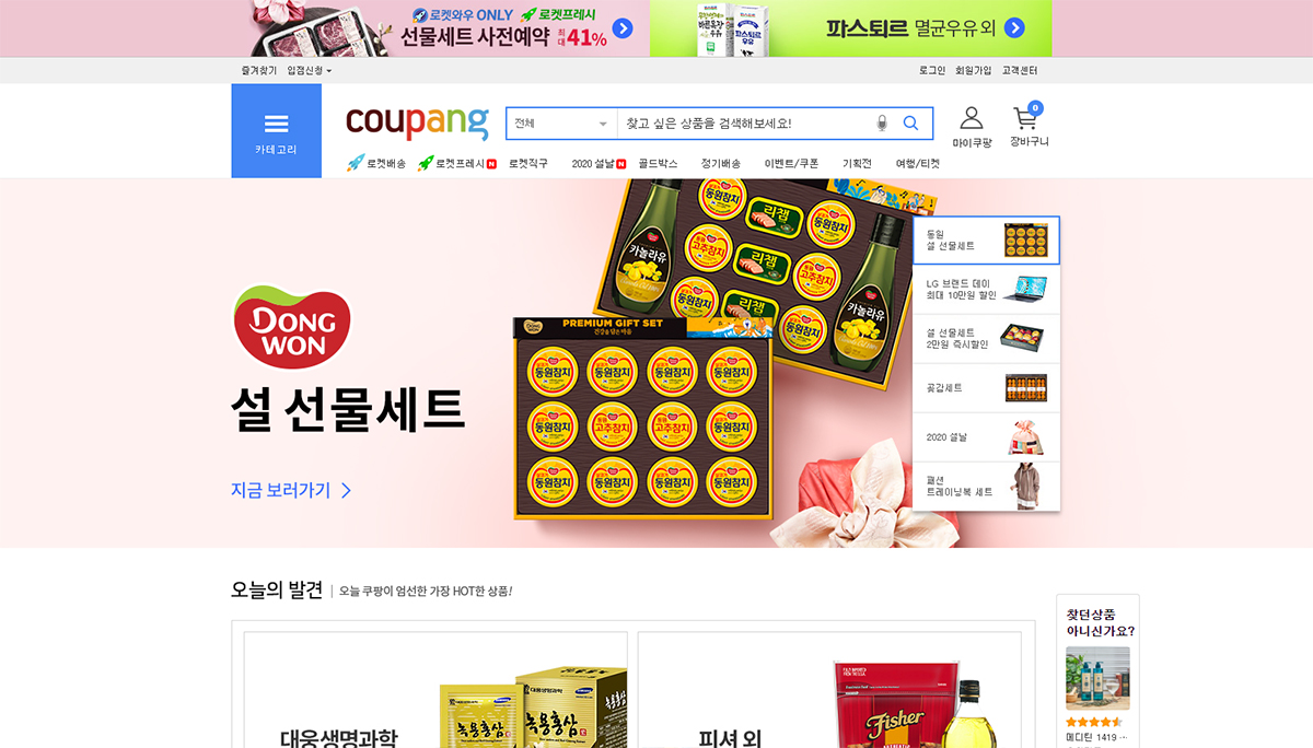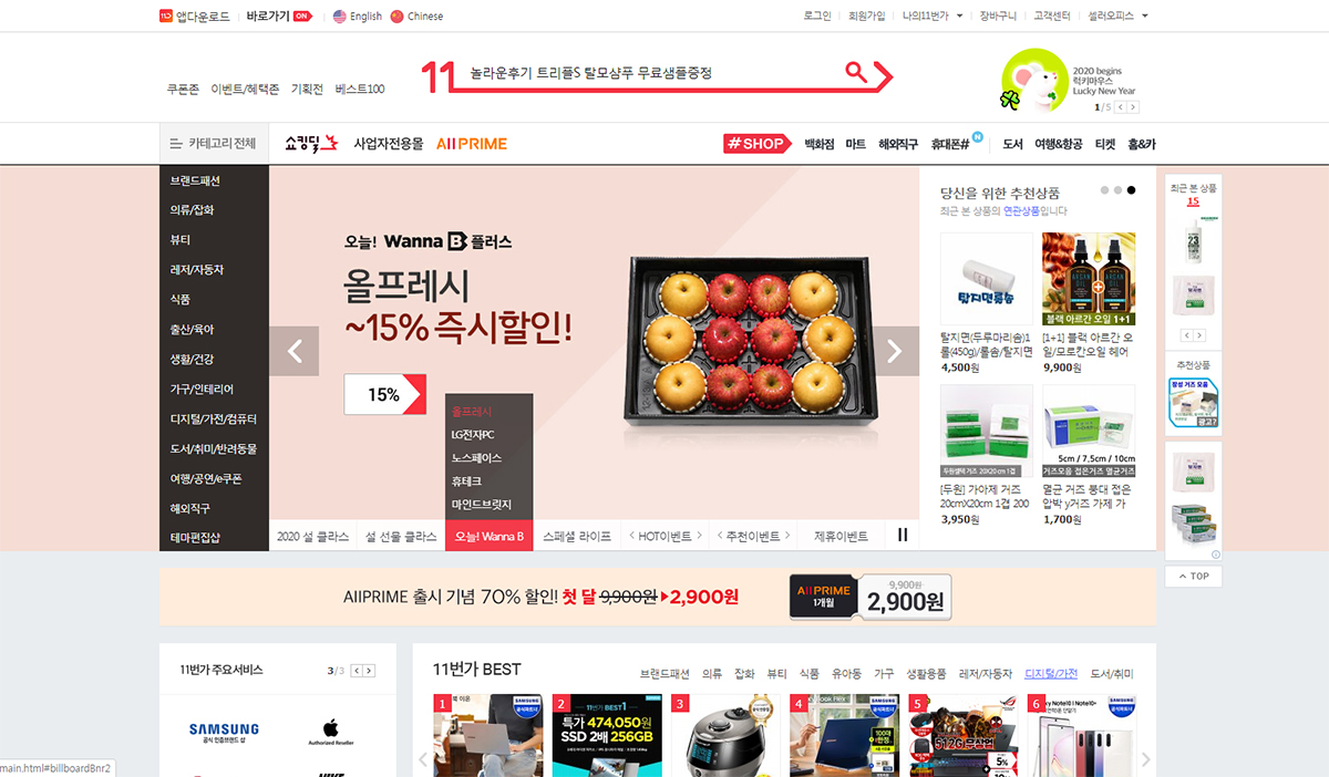 이커머스 사이트의 가장 스탠다드한 UI이다. 좌측에 전체 카테고리를 뿌리고 2 depth는 메가메뉴 형식을 사용했다. 중앙 메인배너는 섹션별로 탑으로 쌓아 최대한 많은 배너를 정돈하여 노출한다. 우측에 추천상품 섹션을 넓게 두었는데 메인배너가 메인을 완전히 장악하지 않고 우측 추천상품으로 시선을 분산시킨다. 돈을 받고 상품을 걸어주는 스폰서 광고 영역이 아닐까 싶다.