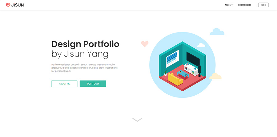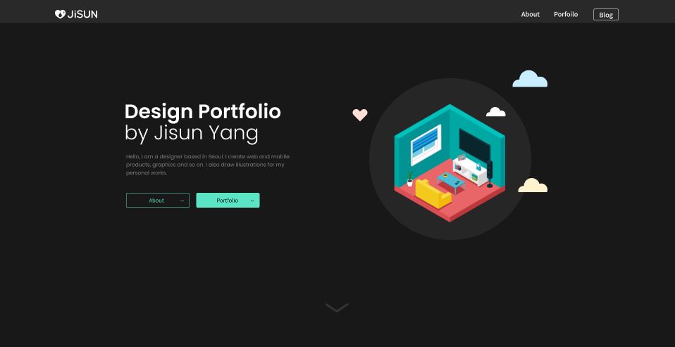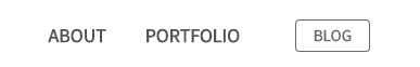 원페이지이지만 상단 메뉴는 유지했다. 이 사이트가 총 몇 개의 메뉴를 가졌는지 알려주는 사이트맵 개념으로 남겨두었다. 메뉴 모양은 기능에 따라 2종류로 분류했다. 하단으로 스크롤 이동하는 About과 Portfolio는 텍스트메뉴로, 외부사이트로 이동하는 Blog는 버튼 모양으로 디자인 했다.