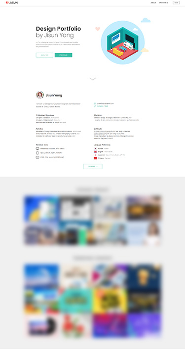 → 컨텐츠가 늘어지지 않도록 구성하고 빠른 이동을 위해 스크롤 이벤트를 활용했고 내용이 많은 About 메뉴는 하단에 more 버튼을 넣어서 펼쳤다 접었다 할 수 있도록 했다.