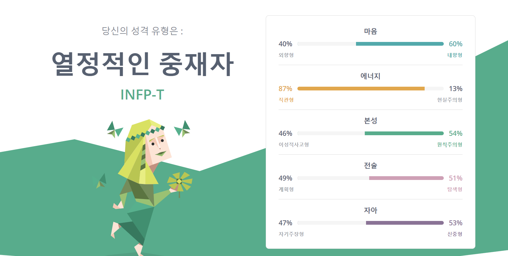오랜만에 MBTI 검사를 해보았는데 2개 사이트에서 각각 다른 결과가 나왔다. T랑 F가 엇비슷해서 왔다갔다 하는 것 같다. 나는 INFP 치고 공감요정도 아니고 INTP처럼 논리에 목숨을 걸지도 않는다. 혼종이 맞는 듯.