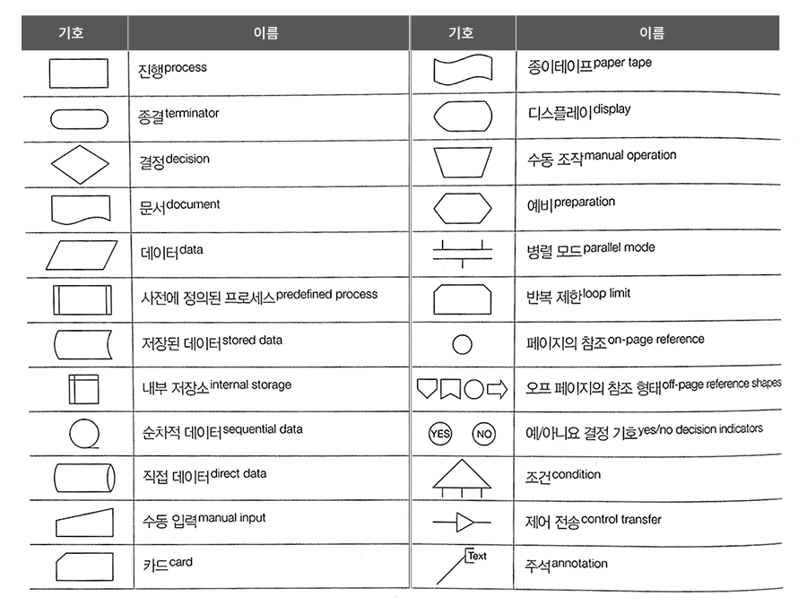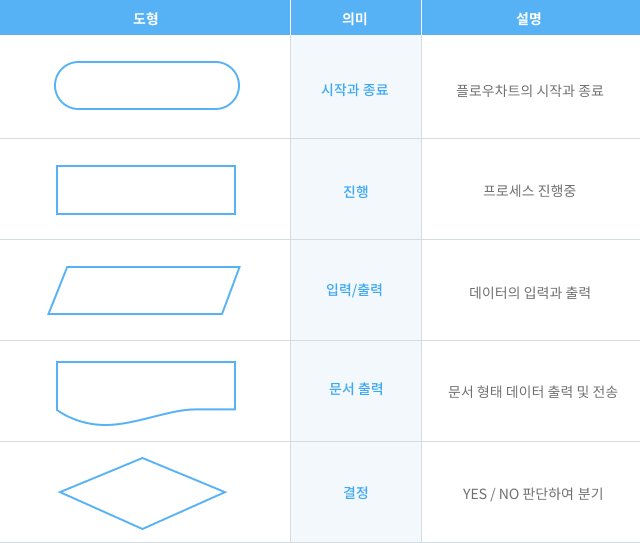이렇게 5가지만 알고 있어도 훌륭한 플로우차트를 그릴 수 있다. 또한 기존에 작성된 플로우차트도 직관적으로 파악할 수 있을 것이다.